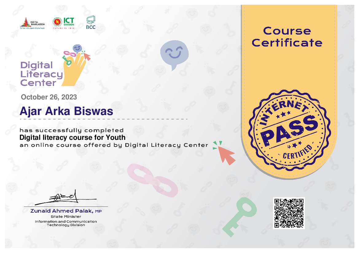জনাব Ajar Arka Biswas, ডিজিটাল লিটারেসি সেন্টার হতে যুবকদের জন্য ডিজিটাল লিটারেসি কোর্স সফলভাবে সম্পন্ন করেছেন।