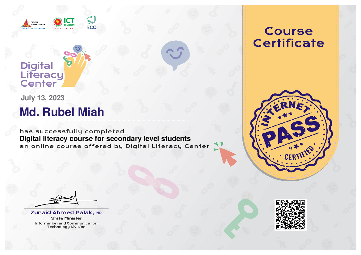জনাব MD. RUBEL MIAH, ডিজিটাল লিটারেসি সেন্টার হতে মাধ্যমিক পর্যায়ের শিক্ষার্থীদের জন্য ডিজিটাল লিটারেসি কোর্স সফলভাবে সম্পন্ন করেছেন।
