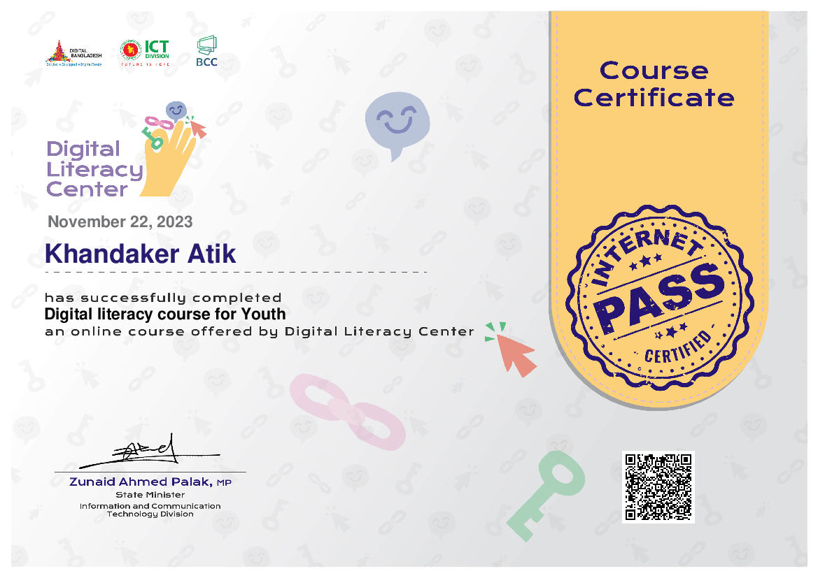 জনাব Khandaker Atik, ডিজিটাল লিটারেসি সেন্টার হতে যুবকদের জন্য ডিজিটাল লিটারেসি কোর্স সফলভাবে সম্পন্ন করেছেন।