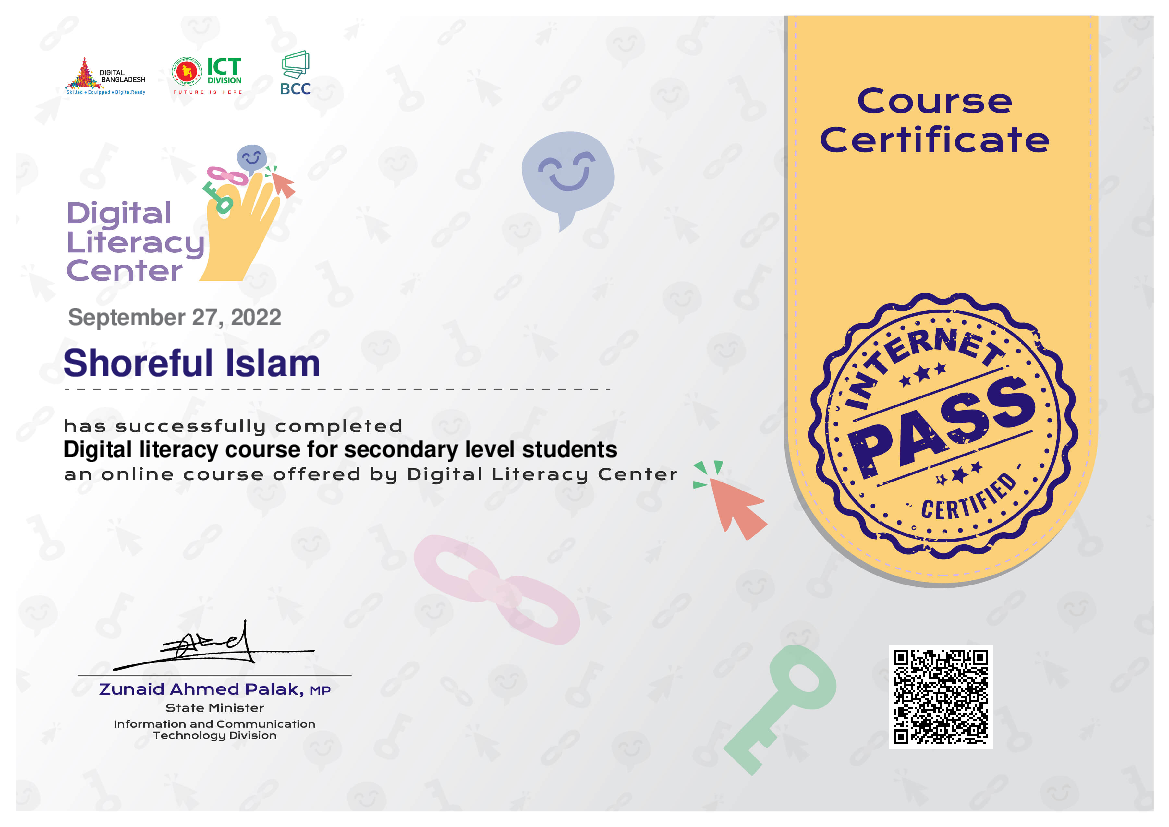 জনাব SHOREFUL ISLAM, ডিজিটাল লিটারেসি সেন্টার হতে মাধ্যমিক পর্যায়ের শিক্ষার্থীদের জন্য ডিজিটাল লিটারেসি কোর্স সফলভাবে সম্পন্ন করেছেন।