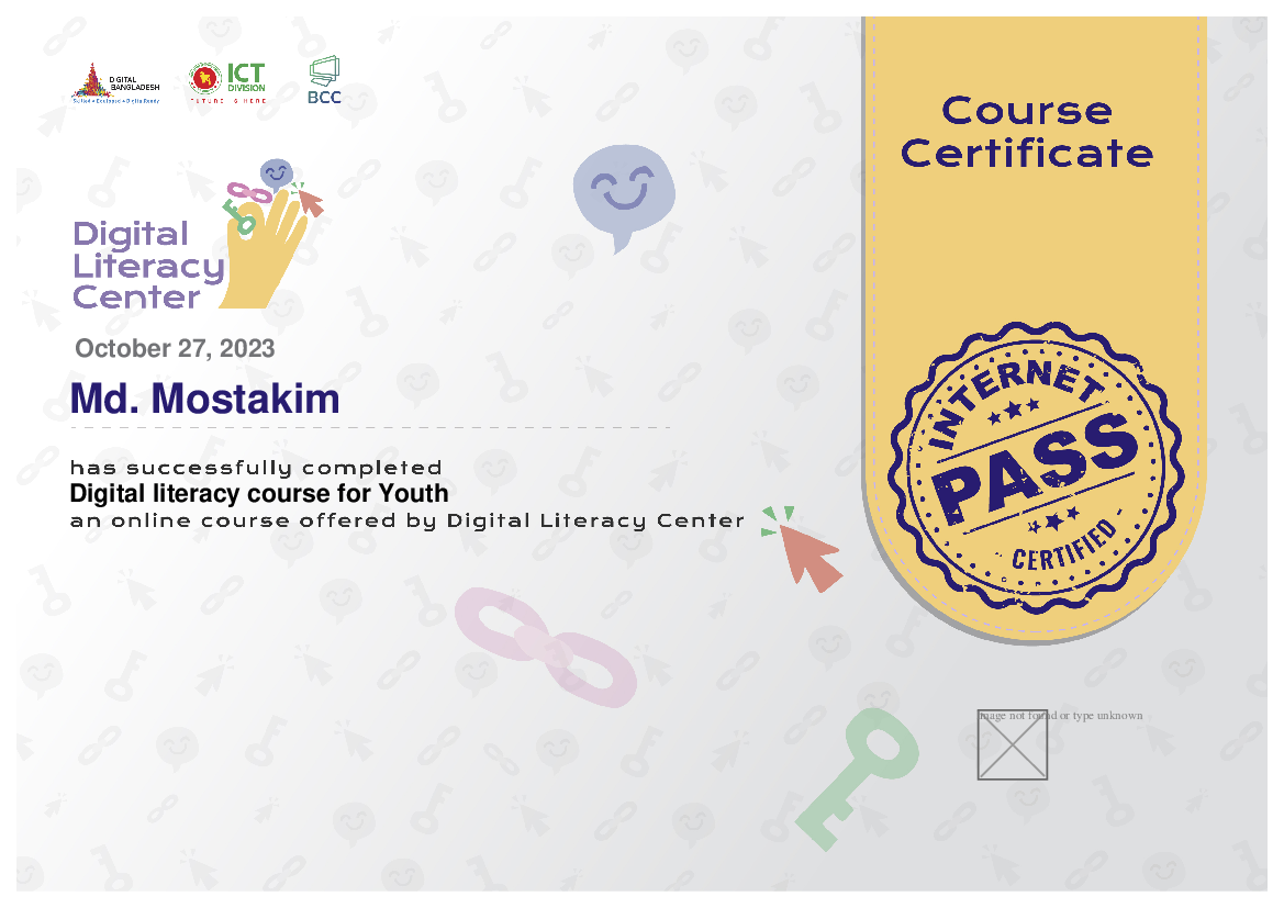 জনাব MD. Mostakim, ডিজিটাল লিটারেসি সেন্টার হতে যুবকদের জন্য ডিজিটাল লিটারেসি কোর্স সফলভাবে সম্পন্ন করেছেন।